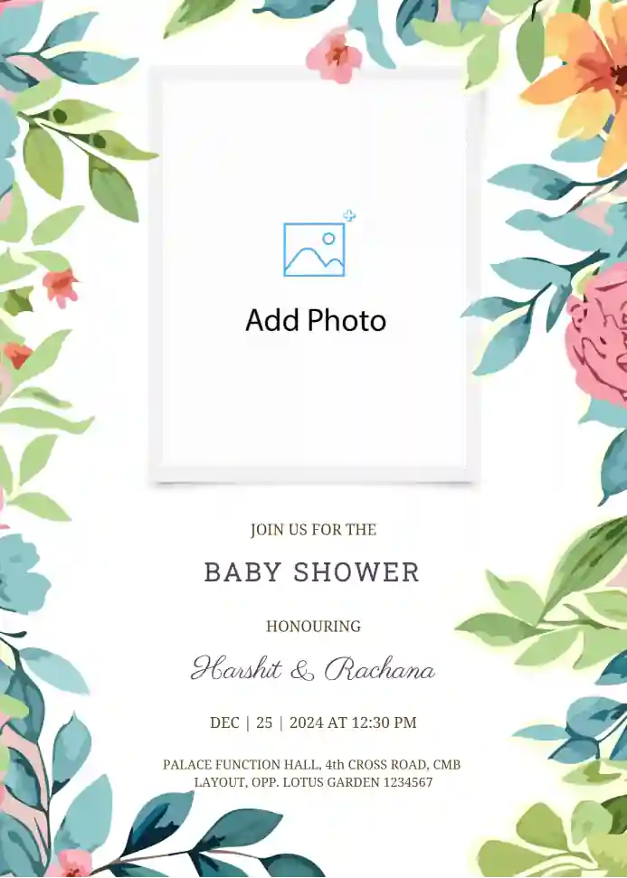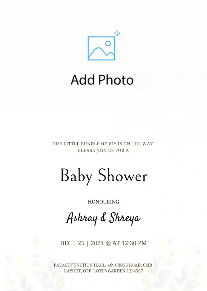 A baby shower is a cherished celebration that marks the upcoming arrival of a new life and the joy it brings to family and friends. It's a time of joy, filled with laughter, games, and thoughtful gifts as everyone gathers to shower the expectant parents with love and support. Creating invitation for such event is an exciting thing for expectant parents. It typically includes key details such as the date, time, and venue of the party, ensuring that guests have all the information they need to join the celebration. InvitationBazaar.com helps you create a personalized baby shower invitation card within minutes using our ready-to-use templates and easy user interface.