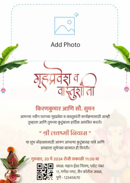 गृहप्रवेश समारोह के लिए अपने दोस्तों और रिश्तेदारों को आमंत्रित करने के लिए आप आसानी से इनविटेशनबाजार वेबसाइट से एक सुंदर निमंत्रण कार्ड बना सकते हैं। एक सुंदर टेम्पलेट चुनकर शुरुआत करें। रंग, फ़ॉन्ट, फ़ोटो और स्टिकर जैसे व्यक्तिगत तत्व जोड़कर इसे अनुकूलित करें। समारोह विवरण दर्ज करें और आयोजन स्थल तक आसान पहुंच के लिए आयोजन स्थल क्यूआर कोड जोड़ें। यह सुनिश्चित करने के लिए अपने निमंत्रण का पूर्वावलोकन करें कि यह उत्तम है, फिर इसे छवि या पीडीएफ के रूप में डाउनलोड करें। इस निमंत्रण को अपने उन दोस्तों और परिवार के साथ साझा करें जिन्हें आप डिजिटल मीडिया के माध्यम से समारोह में आमंत्रित करना चाहते हैं