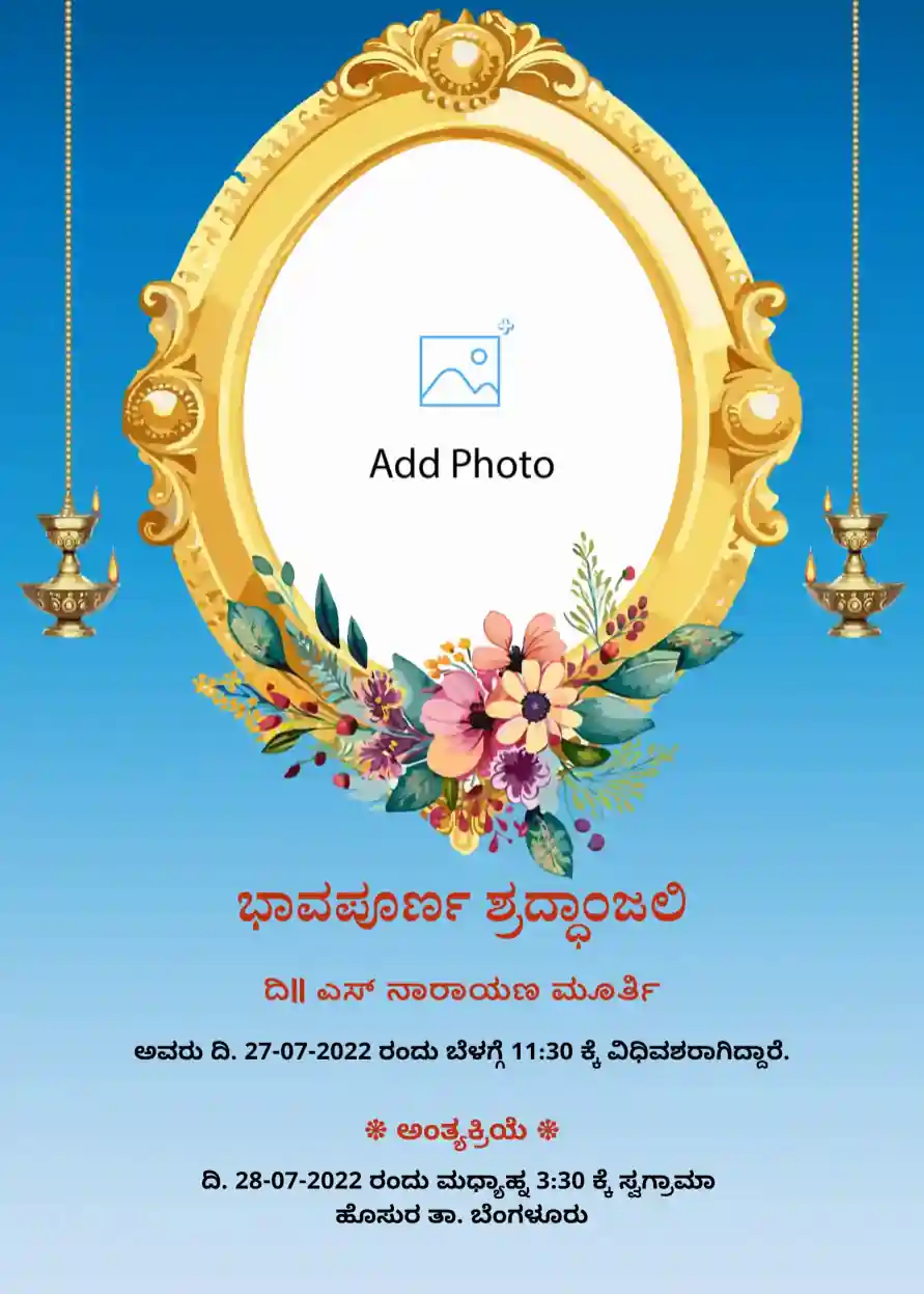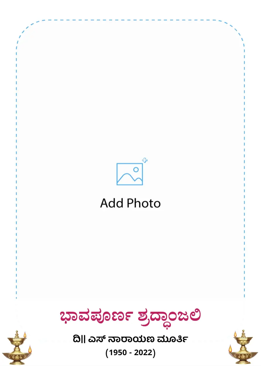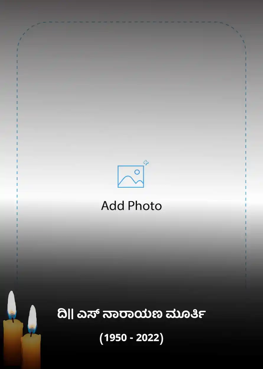 ಪ್ರೀತಿಪಾತ್ರರು ನಮ್ಮನ್ನು ತೊರೆದು ಹಿಂತಿರುಗಲಾಗದ ಜಗತ್ತಿಗೆ ಹೋದಾಗ ಅದು ನೋವುಂಟು ಮಾಡುತ್ತದೆ. ಶ್ರದ್ಧಾಂಜಲಿ ಟೆಂಪ್ಲೇಟ್ಗಾಗಿ ಹುಡುಕುತ್ತಿರುವಿರಾ? ನಮ್ಮ ಪ್ಲಾಟ್ಫಾರ್ಮ್ ಅನ್ನು ಬಳಸಿಕೊಂಡು ನೀವು ಒಂದು ನಿಮಿಷದಲ್ಲಿ ಶ್ರದ್ಧಾಂಜಲಿ ಕಾರ್ಡ್ ಅನ್ನು ರಚಿಸಬಹುದು. ಅನೇಕ ಟೆಂಪ್ಲೇಟುಗಳು ಮತ್ತು ವಿನ್ಯಾಸ ಆಯ್ಕೆಗಳೊಂದಿಗೆ, ಬಳಕೆದಾರರು ತಮ್ಮ ಪ್ರಿಯ ವ್ಯಕ್ತಿಯ ವ್ಯಕ್ತಿತ್ವವನ್ನು ಪ್ರತಿಬಿಂಬಿಸುವ ಕಾರ್ಡ್ ಅನ್ನು ರಚಿಸಲು ಸಾಧ್ಯವಾಗುತ್ತದೆ. ಸ್ವಯಂ-ಉಪಯೋಗಿಸುವ ಇಂಟರ್ಫೇಸ್ ಬಳಸಿ ನೀವು ವೈಯಕ್ತಿಕ ಸಂದೇಶಗಳು, ಫೋಟೋಗಳು ಮತ್ತು ವಿವರಗಳನ್ನು ಸೇರಿಸಬಹುದು, ಇದರಿಂದ ಪ್ರತಿಯೊಂದು ಕಾರ್ಡ್ ಅನ್ನು ಅತ್ಯಂತ ವಿಶೇಷವಾಗಿ ರೂಪಿಸುತ್ತದೆ. ತತ್ಕ್ಷಣ ಡೌನ್ಲೋಡ್ ಮಾಡಿ ಮತ್ತು ಅದನ್ನು WhatsApp status ವಾಗಿ ಬಳಸಿ.