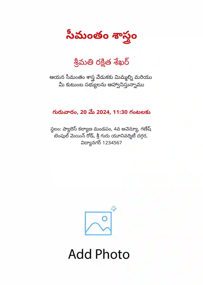 హిందూ సంప్రదాయం ప్రకారం, సీమంతం శాస్త్రం గర్భిణికి 7వ నెల పూర్తి కాగానే ఆమెకు చేసే శాస్త్రం ఇది. ఈ శాస్త్రంలో, గర్భిణీ స్త్రీకి ఆకుపచ్చ చీర, ఆకుపచ్చ గాజు గాజులు ధరించి, హారతి వెలిగిస్తారు. ఇవన్నీ గర్భిణీ స్త్రీకి మరియు ఆమె కడుపులో ఉన్న బిడ్డకు మంచివని నమ్ముతారు. ఈ సందర్భంగా, స్నేహితులు మరియు కుటుంబ సభ్యులు కలిసి రాబోయే శిశువుకు బహుమతులు అందించాలని ఆకాంక్షించారు. అటువంటి కార్యక్రమానికి ఆహ్వానాన్ని రూపొందించడం ఒక ఉత్తేజకరమైన విషయం. ఇది సాధారణంగా వేడుక జరిగే తేదీ, సమయం మరియు స్థానం వంటి ముఖ్యమైన వివరాలను కలిగి ఉంటుంది, అతిథులు వేడుకలో చేరడానికి అవసరమైన మొత్తం సమాచారాన్ని కలిగి ఉండేలా చూసుకుంటారు. InvitationBazaar.com నిమిషాల్లో అందమైన సీమంతం శాస్త్ర ఆహ్వాన కార్డ్ని రూపొందించడంలో మీకు సహాయపడుతుంది.